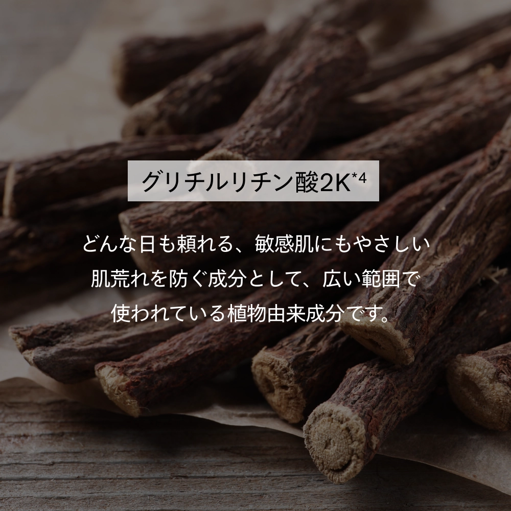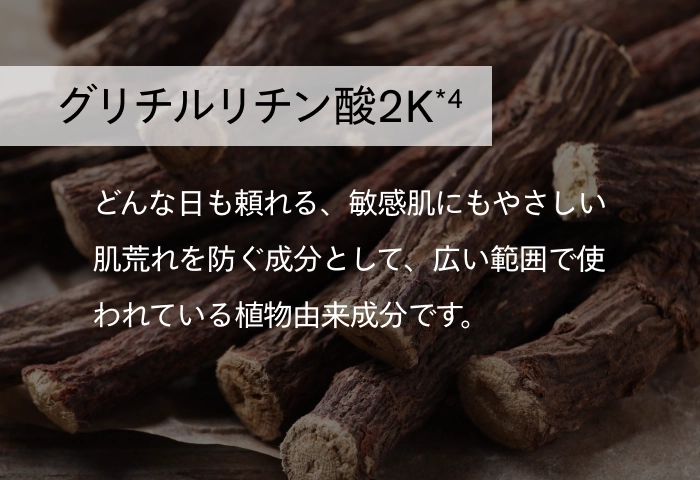 肌をすこやかに整える機能を支えるため、甘草から得られるグリチルリチン酸2K